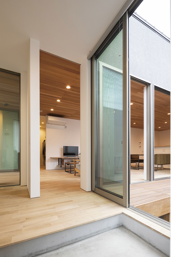家の中央に配置された中庭が特徴的な家。採光性と通気性が確保できると同時に、カーテンがなくてもプライバシーが守られ、気持ちよく生活することができます。
