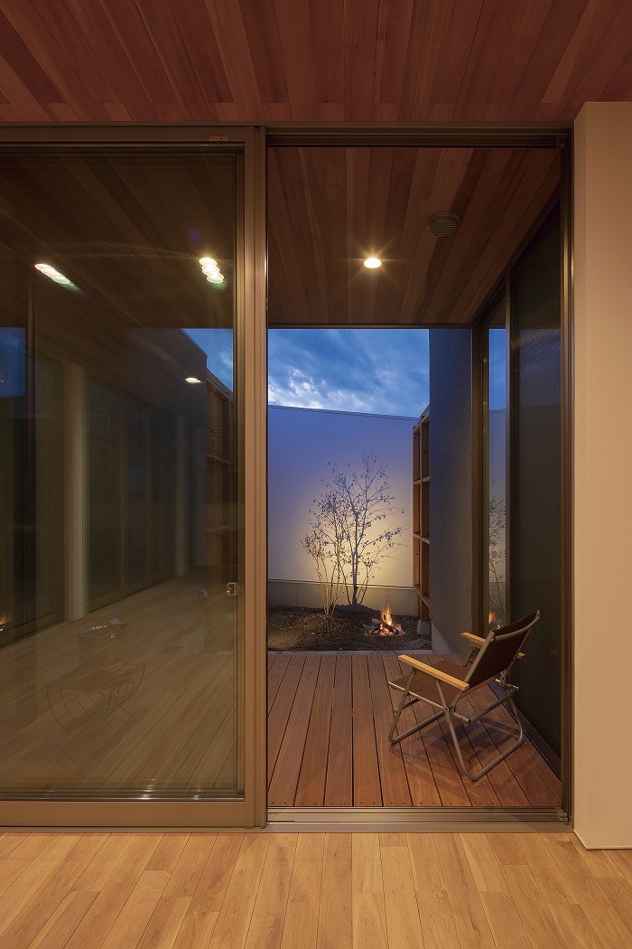 部屋をコの字形に配置することで家の中に心地よい光と風を取り入れました。タイル仕上げの開放感ある中庭は「家族がくつろげる」をコンセプトに子供たちの水遊びや休日のバーベキューに大活躍。用途は無限大です。