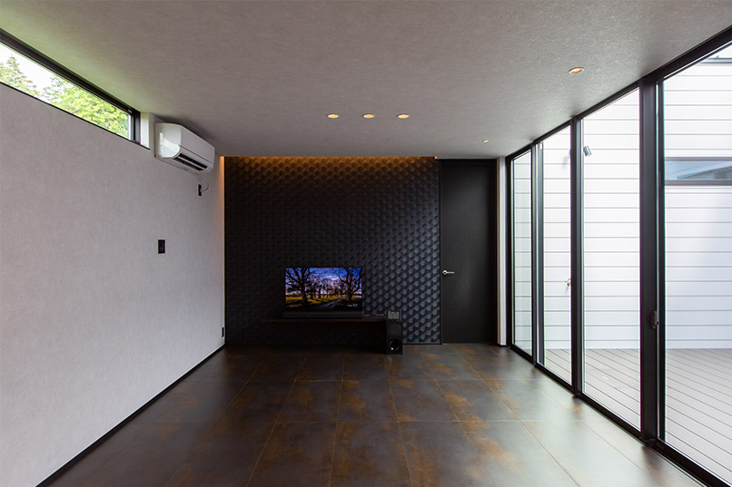建物の中心に中庭を設けることで、外側に大きな窓をつくらなくても光を取り込むことが可能となり、同時に外部からの目線を気にせず開放感のある室内を実現できました。外観はブラックのガルバリウムとレッドシダーでメリハリのある印象に。