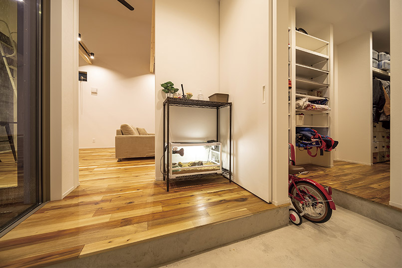 子供部屋のみを1階の部屋よりも高く配置し、その下を趣味のアウトドアスペースに。ロードバイクなどを収納できる土間としました。子供部屋からリビングを吹抜けにして開放感を演出すると同時に、階段を隠すことで2階建てであることを忘れるような空間に。