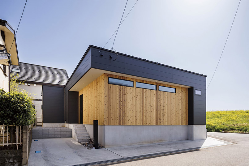 外壁は黒いガルバリウムをベースとし、無垢材のレッドシダーをアクセントに採用することで、どこか温もりを感じる外観に。夜間に光がもれる格子窓も建物にかわいらしい印象を与えてくれます。