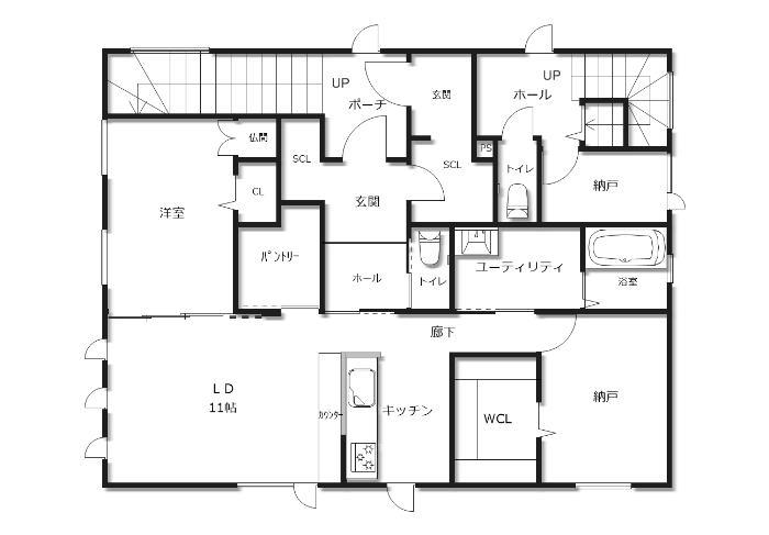 水回りを一か所にまとめ、暮らしの動線もコンパクトにすることで、親世帯の方でも無理なくゆとりを持って過ごせます。車椅子になる将来も考え、廊下は広めに設計しています。