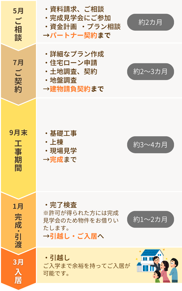 お子様のご入学に合わせて家を建てようとお考えの方は、逆算してスケジュールを立てながら進めていく必要があります。4月の入学に備えて、3月には新居へお引越しするのが理想的です。