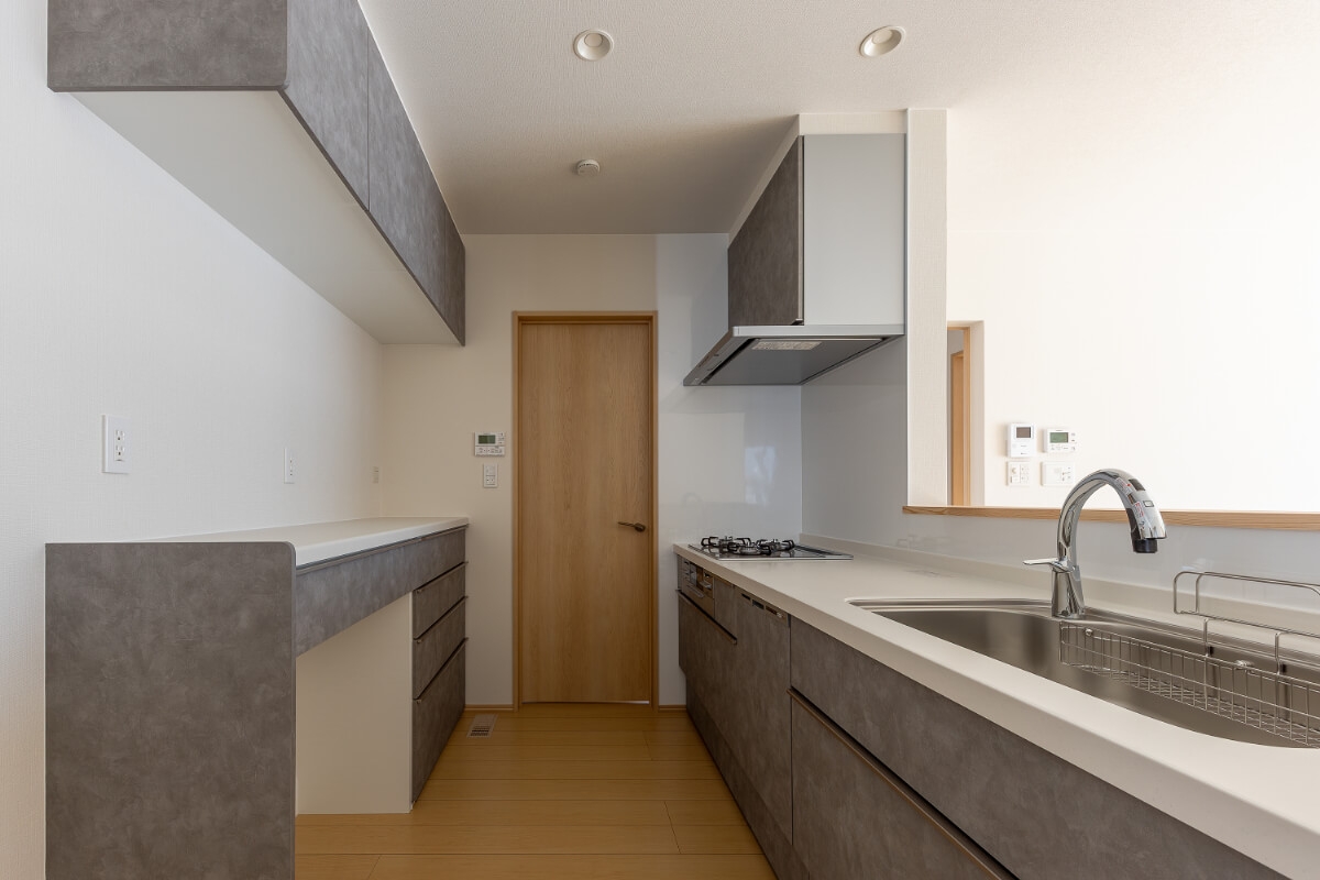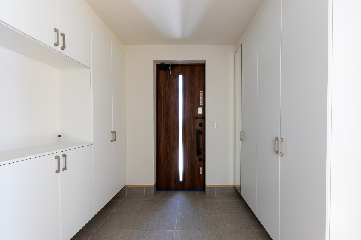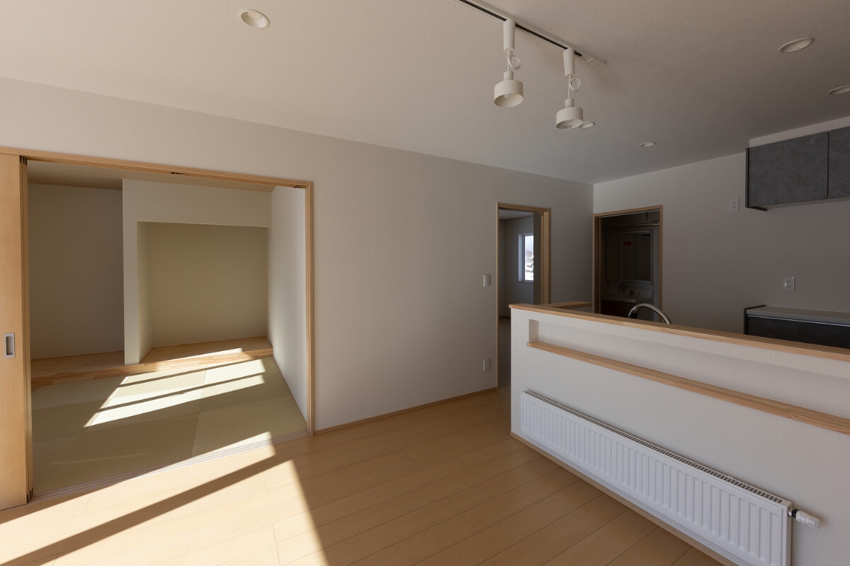 住まいの中心にはリビングを配置。キッチンから空間全体を見渡すことができ、家族の気配を感じながら過ごせる設計です。1階の5.2帖の和室は客間としてはもちろん、日常のくつろぎスペースとしても活躍。主寝室は8帖とゆとりを確保し、スリムなクローゼットを設けて空間をすっきりと使えるよう工夫しました。
