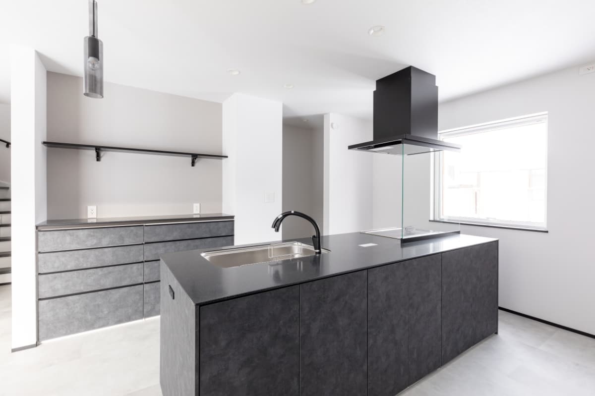 存在感のあるキッチンは、重厚感のあるブラックのアイランドタイプ。